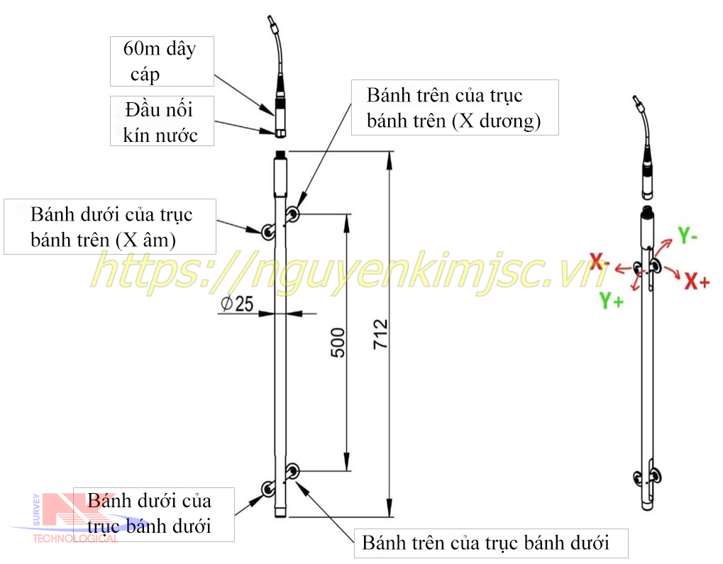 1.2.1 Đầu dò cảm biến bao gồm khớp cáp vỏ thép không gỉ và hai bộ bánh xe dẫn hướng.