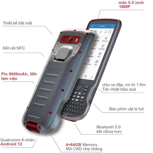 Sổ tay R60 với màn hình 5.5 inch, hiển thị 1080 HD, kết nối 1 chạm. Bộ vi xử lý Qualcom 8 nhân, hệ điều hành android 12 vận hành mượt mà, dung lượng 64Gb mở bản cad nhanh chóng, nhẹ nhàng. Công nghệ BluetoothA5.0 cho phép kết nối nhanh hơn. thao tác cảm ứng kết hợp bàn phím full Qwerty giúp thao tác nhanh hơn và hiệu quả. Thiết kế khỏe, chắc chắn, chịu va đập, sống sót khi rơi từ độ cao 1.6m. Pin dung lượng lớn lên tới 9000 mAh làm việc liên tục 30 giờ không nghỉ, sạc QC 3.0 giúp sạc nhanh chóng. Phần mềm Survey Master miễn phí, phiên bản tiếng việt nhiều ứng dụng, dễ dàng thao tác