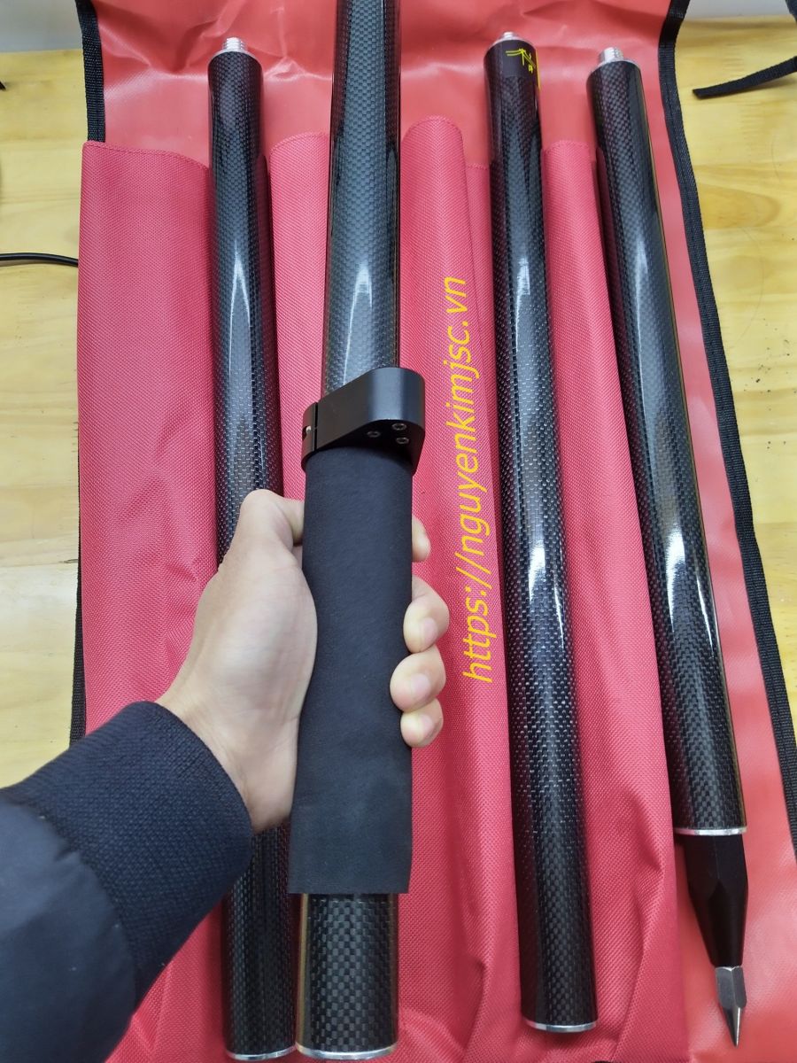 Sào RTK Cacbon 4 đốt được làm bằng vật liệu cao su giúp người dùng cầm nắm chắc chắn không bị cấn giảm thiểu rơi đổ thiết bị đo.