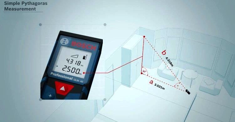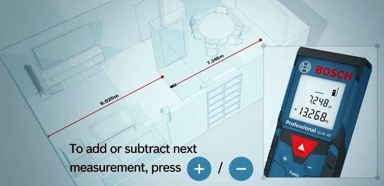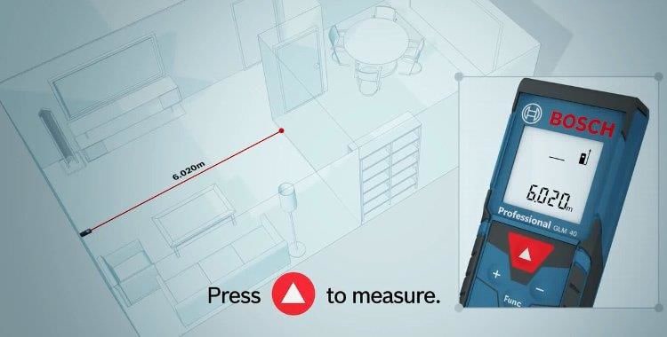 Sau khi đo chiều ngang và chiều dọc của vật thể cần đo, máy đo khoảng cách Bosch GLM 40 sẽ ngay lập tức cho kết quả diện tích của vật thể, tương tự sau khi đo chiều dài, chiều rộng và chiều cao của vật thể máy sẽ cho kết quả là thể tích của vật thể