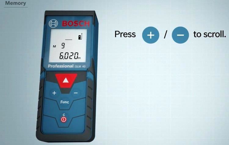 Ngoài ra, thước đo điện tử Bosch GLM-40 có khả năng lưu được 10 kết quả phục vụ công việc đo liên tục. Thực hiện bằng cách sử dụng nút Func chuyển về chế độ có hiển thị M 10 và nút + và - để xem lại các kết quả đã đo trước đấy.