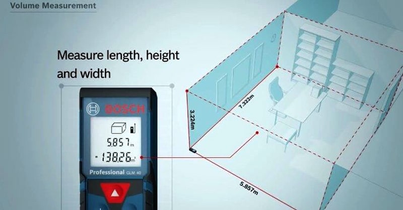 Sau khi đo chiều ngang và chiều dọc của vật thể cần đo, máy đo khoảng cách Bosch GLM 40 sẽ ngay lập tức cho kết quả diện tích của vật thể, tương tự sau khi đo chiều dài, chiều rộng và chiều cao của vật thể máy sẽ cho kết quả là thể tích của vật thể